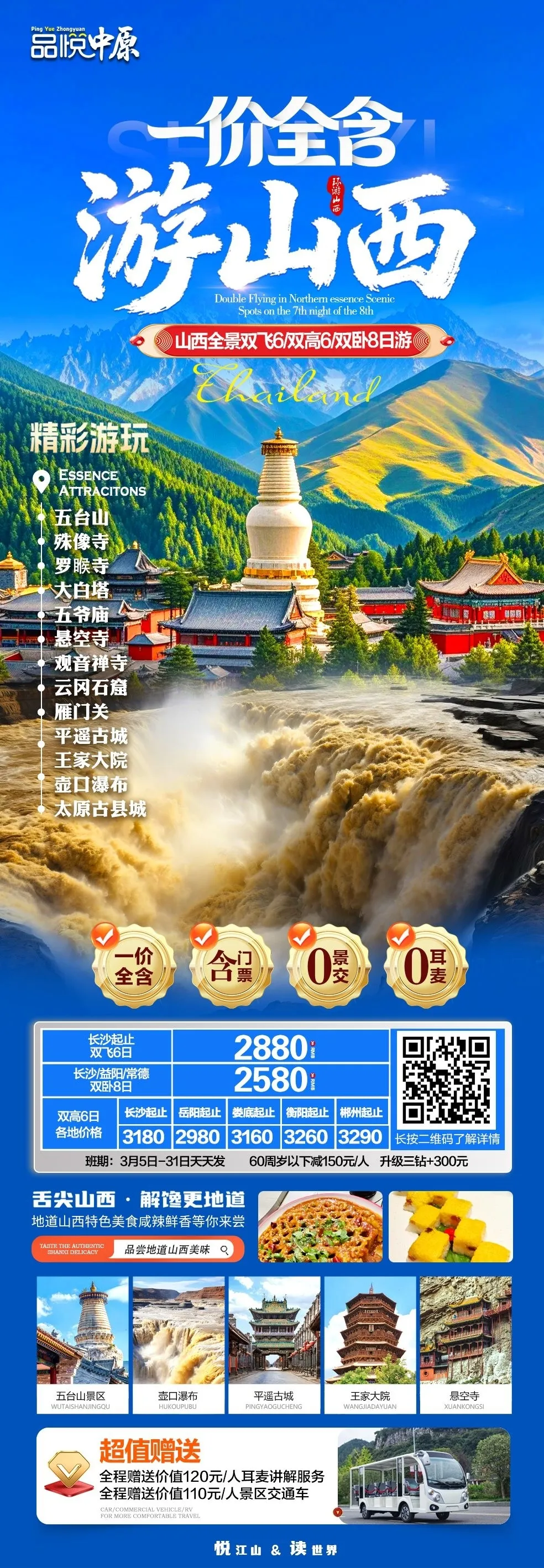 1、门票:含全程景区门票(云冈石窟、悬空寺首道、五台山、王家大院、壶口瀑布、雁门关、平遥古城自由行不含平遥套票)