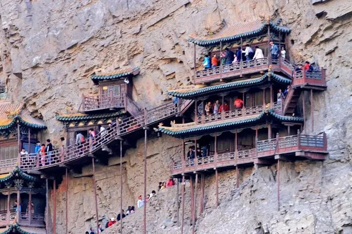 【悬空寺】(游览约 1 小时)(只进行外观,不进行登临感谢配合 )全寺为木质框架式结构,最值得惊叹的是它依靠榫接结构,距今已有 1500 多年历史,嵌入崖内而不倒。诗仙李白观后醉书壮观,徐霞客赞为天下巨观。