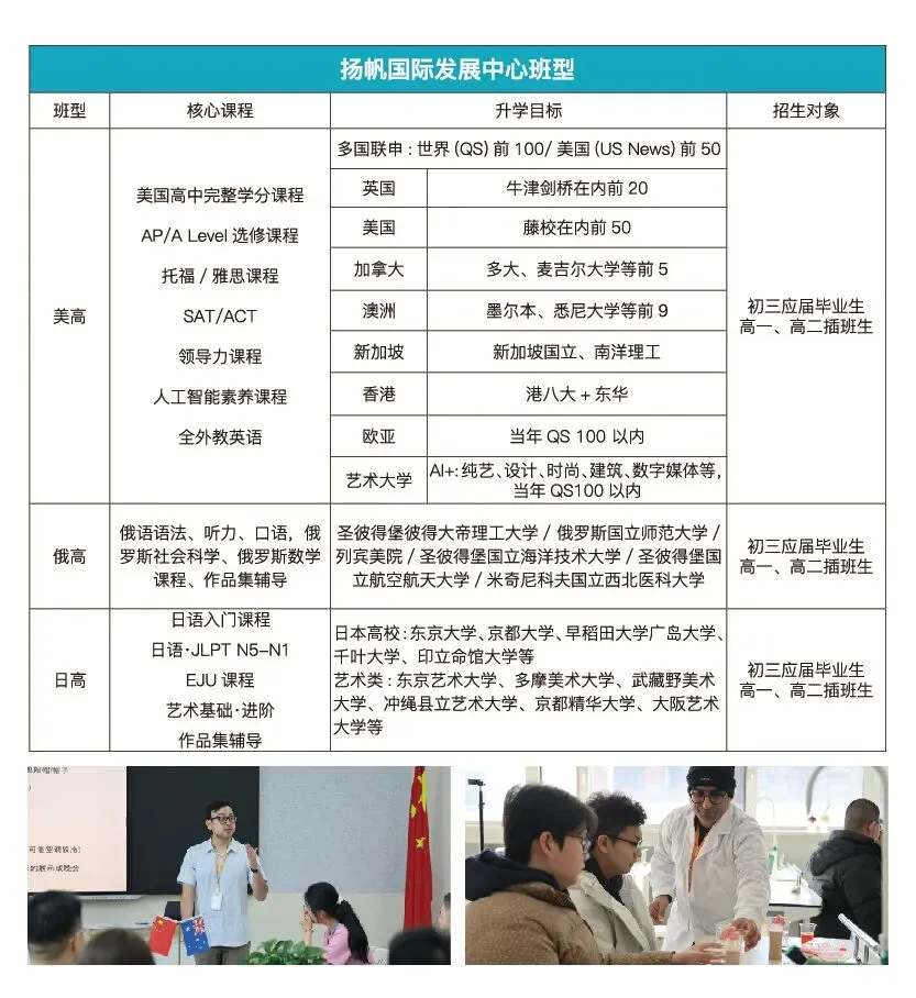 学校成立扬帆国际发展中心,致力于为学生提供多元、优质、个性化的成长路径,培养具有国际视野、能够参与国际竞争的复合型人才,助力每位学子跨越语言障碍,实现从“中国课堂”到“世界舞台”的蜕变。我们精心构建了“一门进,三门出”的多元课程体系,开设美国高中课程(美高)、俄罗斯高中课程(俄高)、日本高中课程(日高)三大方向,为学生铺就通往不同国家和地区的个性化升学之路。