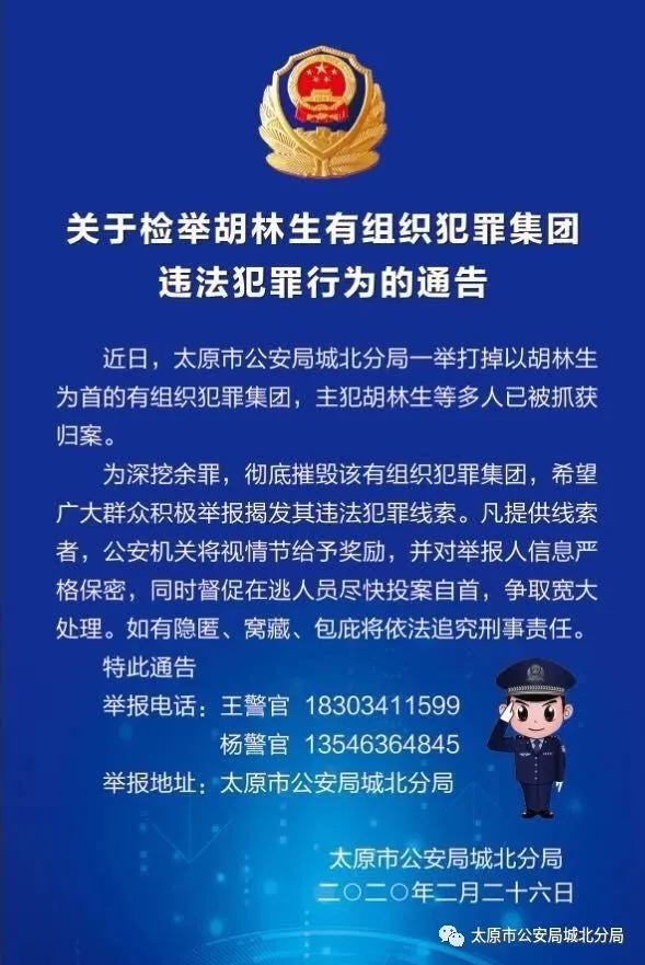 3月2日,从太原市公安局城北分局获悉,近日,该局一举打掉了以胡林生为首的有组织犯罪集团,主犯胡林生等多人已被抓获归案。