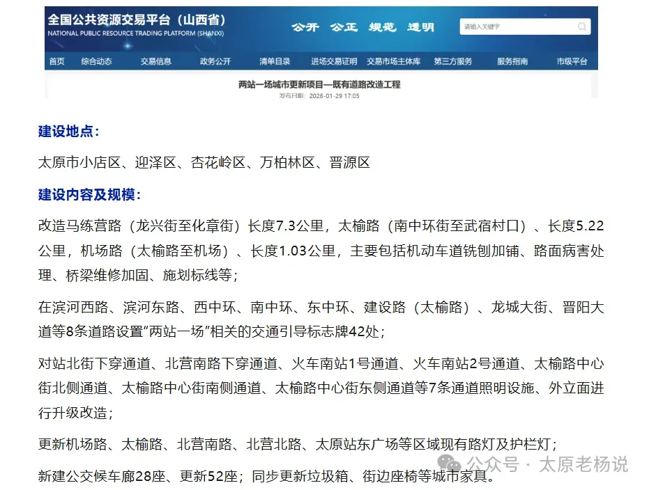 近日,山西省公共资源交易中心发布两站一场城市更新项目——既有道路改造工程招标计划,项目总投资42172.53万元,建设地点涵盖太原市小店区、迎泽区等五区。建设内容丰富:改造马练营路、太榆路、机场路等多条道路,包括机动车道铣刨加铺、桥梁维修加固等;在滨河西路等8条道路设42处“两站一场”交通引导标志牌;对站北街等7条通道照明设施和外立面升级改造;更新机场路等多区域现有路灯及护栏灯;新建28座、更新52座公交候车廊,同步更新垃圾箱、街边座椅等城市家具。来源:山西省公共资源交易中心