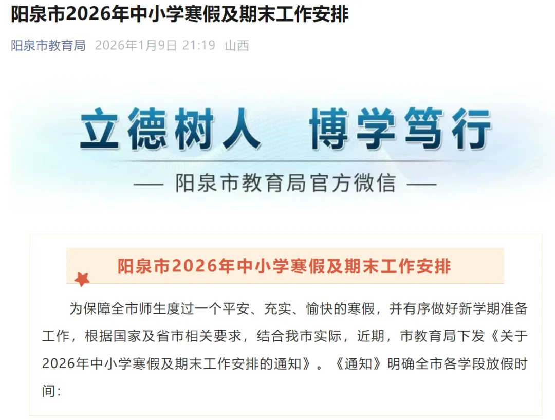✅晋城市义务教育阶段学校放假时间2026年2月5日(腊月十八)至2026年3月5日(正月十七)。开学时间为2026年3月6日。