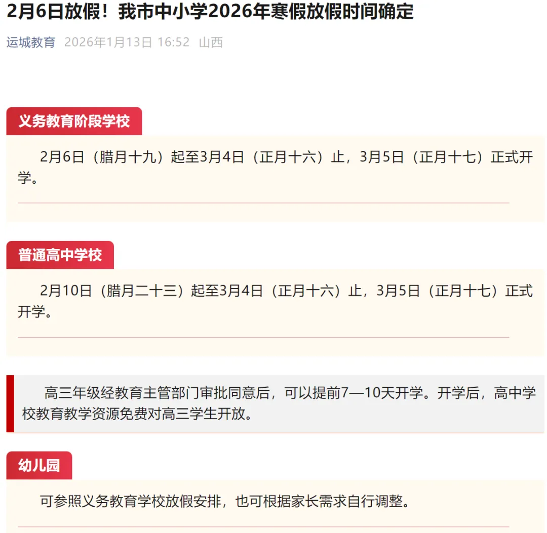 ✅义务教育阶段学校:寒假自2026年2月5日(农历腊月十八)开始,至3月4日(农历正月十六)结束。3月5日(农历正月十七)正式开学。幼儿园参照执行。