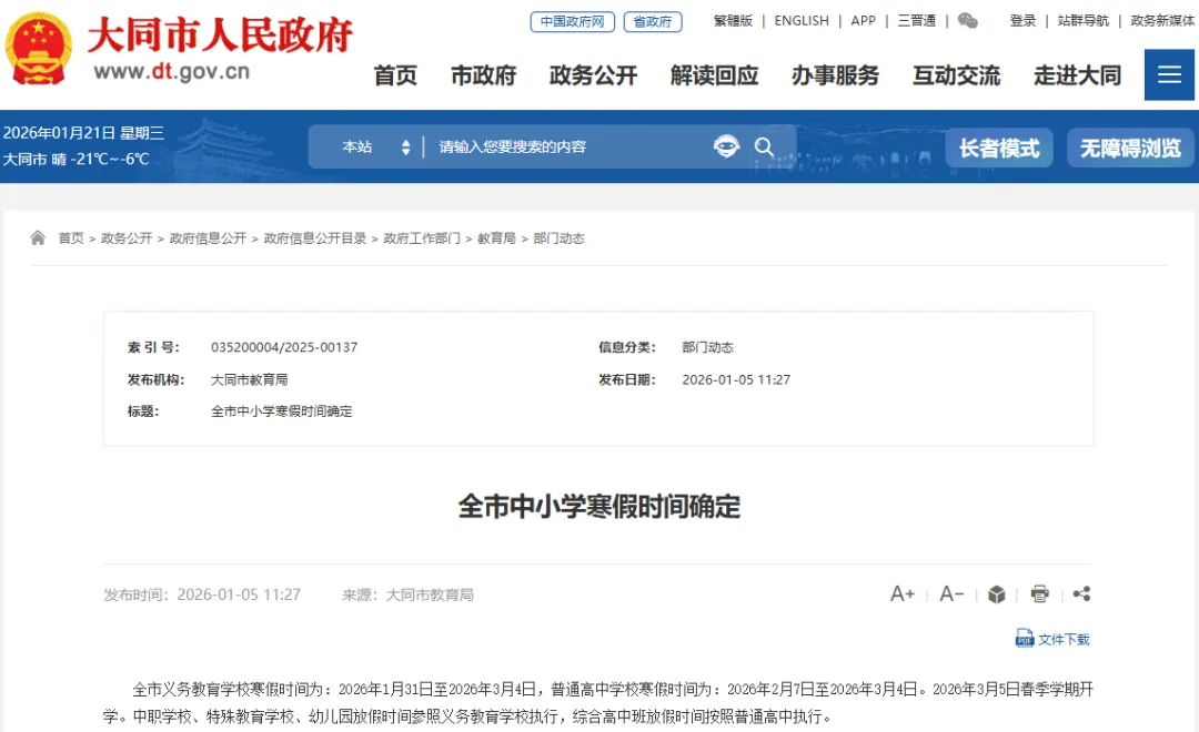 大同市义务教育学校寒假时间定为1月31日至3月4日,普通高中学校为2月7日至3月4日。中职学校、特殊教育学校、幼儿园放假时间参照义务教育学校执行,综合高中班放假时间按照普通高中执行。3月5日,春季学期开学。