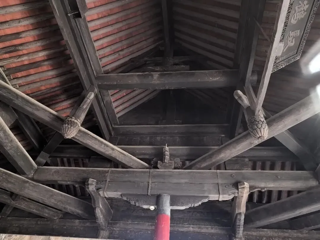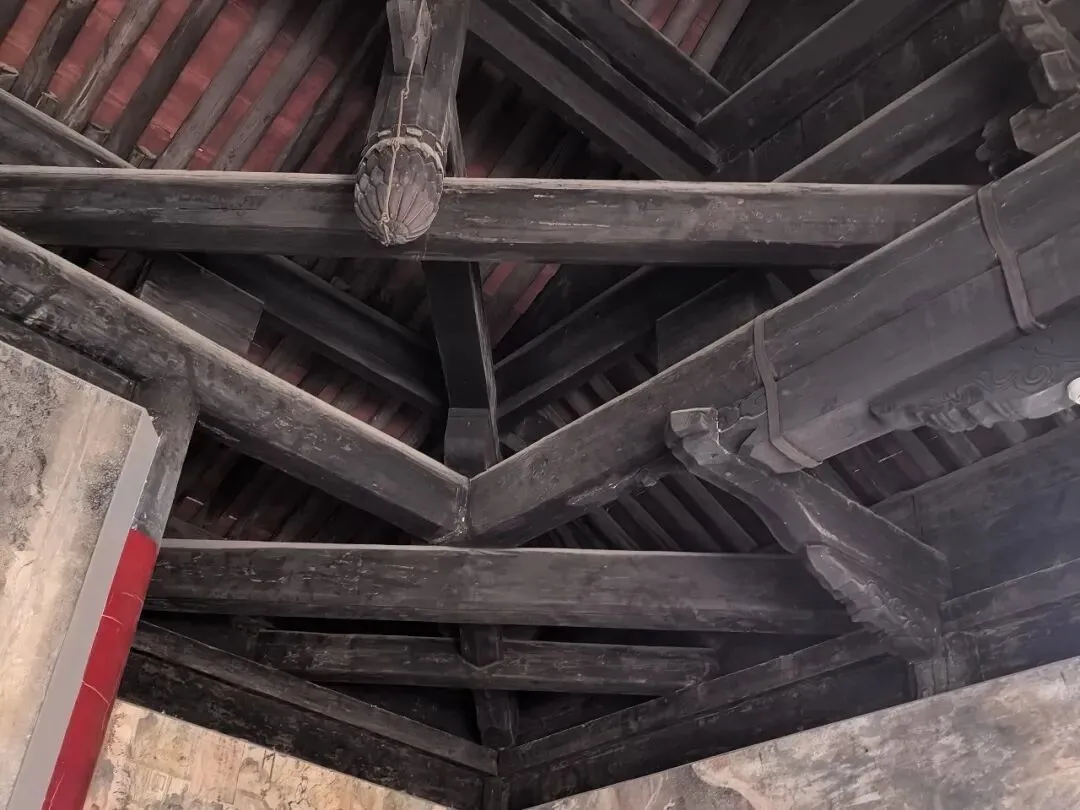 殿内采用移柱造技法,减少内柱数量,扩大祭祀空间,体现明代木构“实用与美学统一”的理念。梁架简洁、榫卯精密,无一颗钉子却屹立四百年不倒,结合抹角梁与垂柱的协同作用,即便历经风雨,仍保持稳固,是中国古建“以柔克刚”哲学的实物见证。抬头仰望梁架,榫卯咬合的痕迹清晰可见,每一处衔接都严丝合缝,驼峰、丁华抹颏拱等构件的雕刻简约而精致,这便是古建的魅力——无需钢筋水泥,仅凭工匠的智慧与技艺,便能抵御岁月风雨,传承千年文脉。