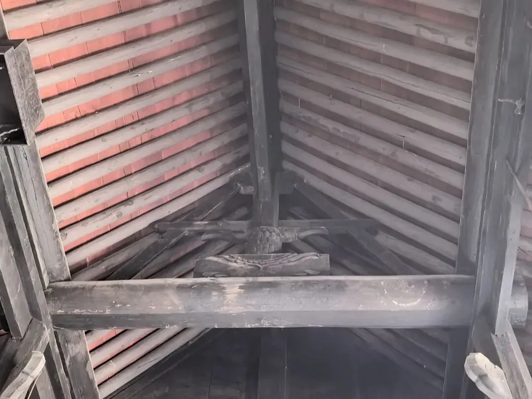 此外,吕祖殿的檩枋构件也极具山西地域特色,由檩、随檩枋、垫墩及顺脊串组成,未采用北京官式的“檩三件”做法,瓜柱头设顺脊串拉结梁架,三架梁中雕花驼峰承托底刻仰莲的瓜柱,瓜柱上下各出丁华抹颏拱一道,配合叉手捧戗脊檩,既稳固构件,又兼具装饰性,是唐宋驼峰承蜀柱做法的延续与创新。而屋顶举架则遵循“上尊而宇卑”的原则,总举高与前后檐檩间距之比为1:2.9,檐步架四三举、金步架五六举、脊步架达十一举,下缓上陡的坡度,既利于排水,又能让室内获得充足光线,与太原府城其他明代建筑的举架特征高度一致。