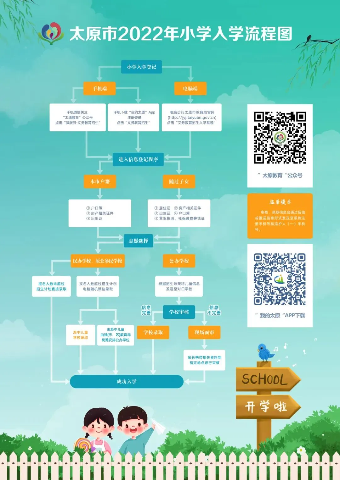 · 持续强化招生服务。充分考虑疫情防控需要,入学材料审核坚持“非必要不线下”原则,进一步优化入学工作方案,为家长提供方便快捷的入学服务。各县(市、区)教育局及学校要积极落实我市小学入学“最多跑一次”改革要求,依托“太原市义务教育招生入学系统”,对符合入学条件的适龄儿童实现“入学跑零次”,对确需现场审核的要尽量实现“入学跑一次”。