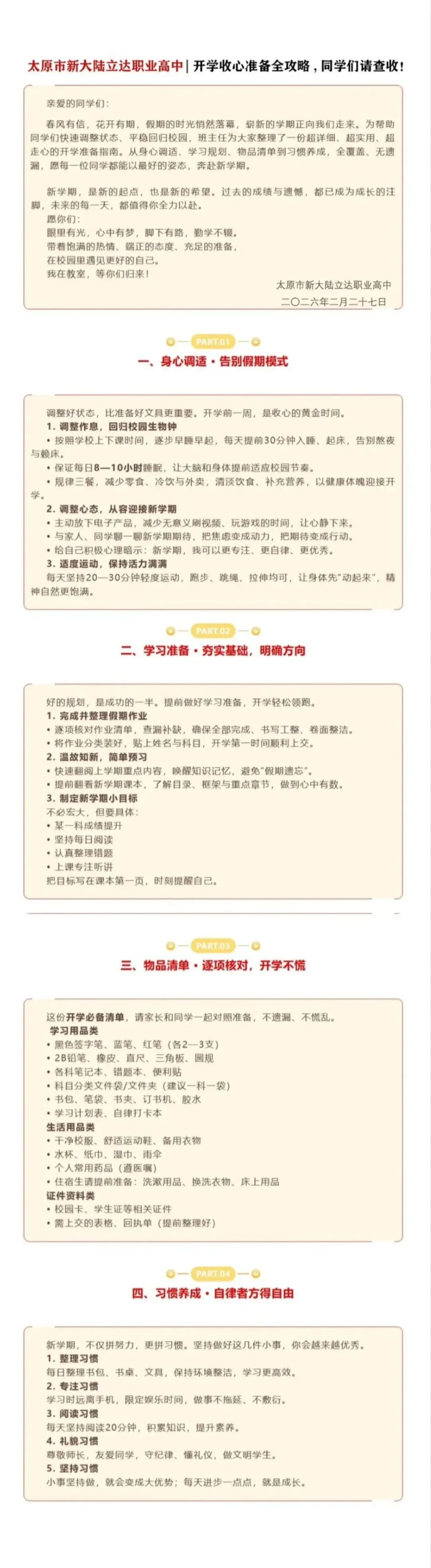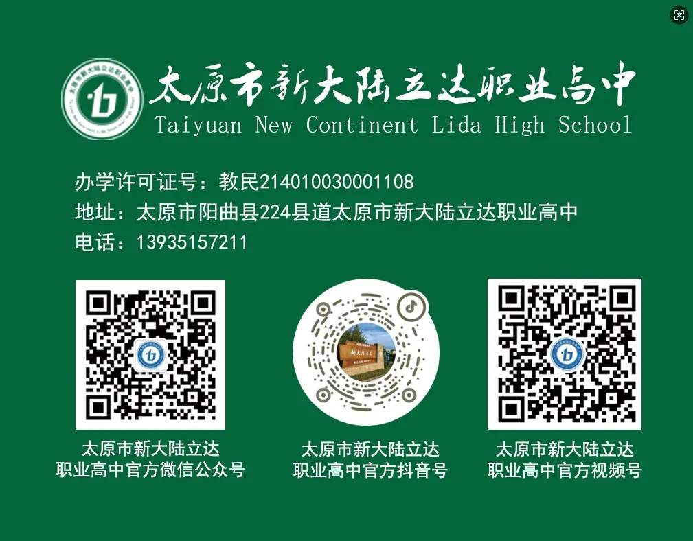 太原市新大陆立达职业高中是北京星大路教育集团投资举办,太原市行政审批局、教育局批准设立的特色高中,办学许可证号教民214010030001108。学校秉承“顺应天赋 因材施教”的教育理念,以“内驱力教育”为核心,以培养自信、自律、自强、充满上进心的新时代中学生为目标,通过“修文修心、育德正心、教学同心、家校一心”的培养模式,为国家培养了数以万计的栋梁之材,受到社会各界特别是广大学生和家长广泛好评和一致信赖。