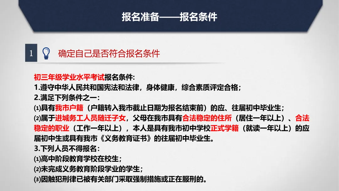 1.初中毕业学校和县(市、区)招生考试机构(以下简称报名单位)审查考生的报名资格(学籍、户口簿、《居民身份证》、《义务教育证书》等)。