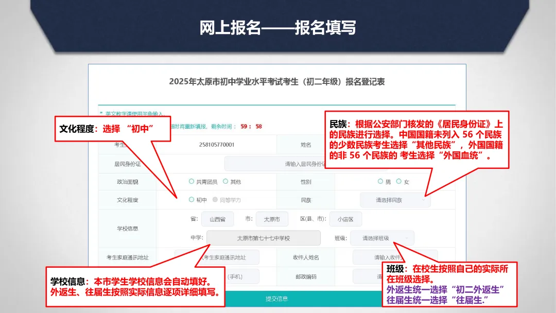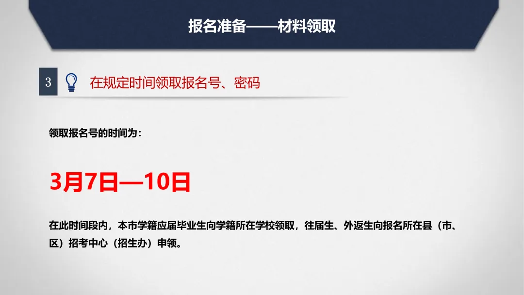 2.报名单位审查核发“中考报名号”、“报名登录密码”;考生交验有关证明材料(进城务工人员随迁子女材料、政策性加分材料等)。