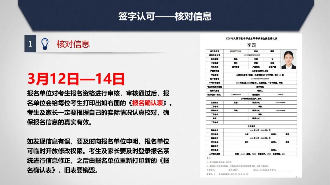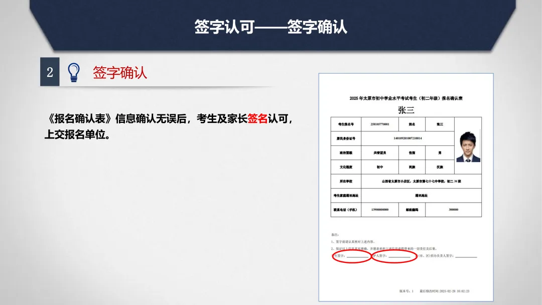 5.报名单位打印《初中学业水平考试报名确认表》,由考生、考生家长和班主任(区招办审核人员)进行校对并签字。