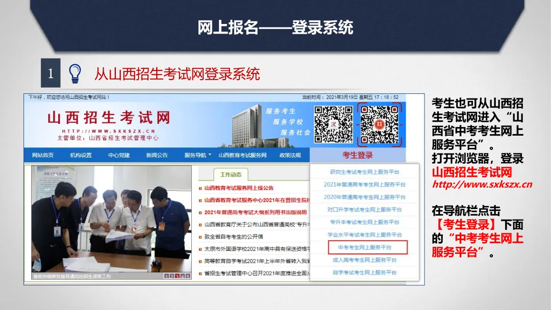 3.考生登录“山西招生考试网(http://www.sxkszx.cn)”,在导航栏点击“考生登录”—“中考考生网上服务平台”进入“山西省中考考生网上服务平台”进行网上报名。