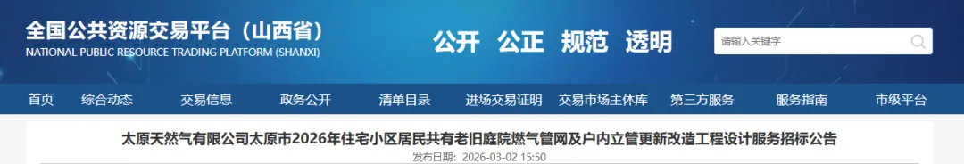 3月2日,记者从全国公共资源交易平台获悉,太原天然气有限公司太原市2026年住宅小区居民共有老旧庭院燃气管网及户内立管更新改造工程设计服务招标公告已公示。