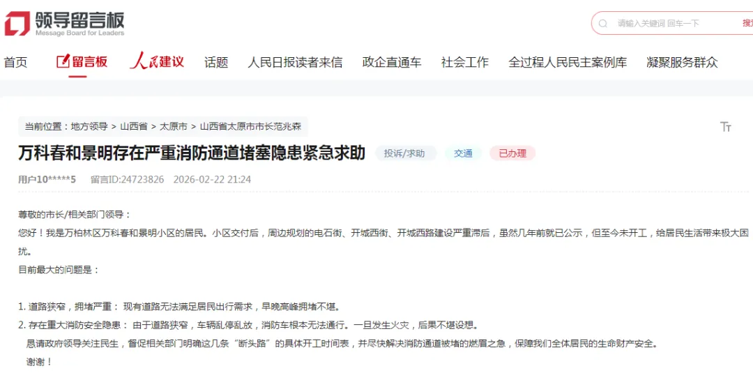 记者从人民网领导留言板获悉,网友反映太原市万科春和景明存在消防通道堵塞问题:小区交付后,周边规划的电石街、开城西街、开城西路建设严重滞后,虽然几年前就已公示,但至今未开工,给居民生活带来极大困扰。