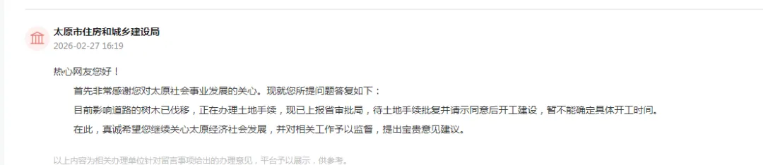 目前影响道路的树木已伐移,正在办理土地手续,现已上报省审批局,待土地手续批复并请示同意后开工建设,暂不能确定具体开工时间。(来源:黄河电视台)