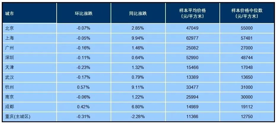 十大重点城市二手住宅平均价格为33399元/平方米,环比下跌0.42%。具体来看,南京、北京环比跌幅较大,均超过0.6%;上海、重庆(主城区)、广州、天津环比跌幅均在0.4%(含)~0.6%之间;成都和武汉环比跌幅均为0.39%;深圳和杭州跌幅均小于0.2%,其中杭州跌幅最小,为0.14%。