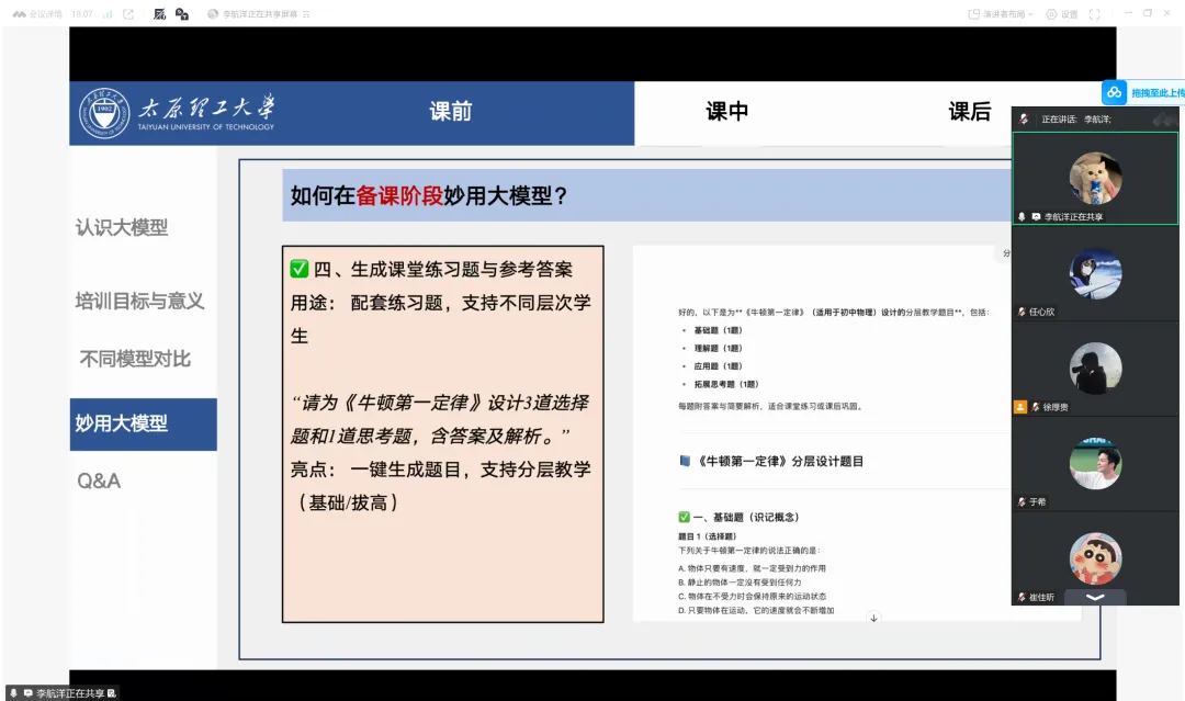 本次培训以大语言模型的核心认知为起点,从“是什么、怎么用、用得好” 三个维度展开,通过生动案例展示了其在语言理解与生成、多语言翻译、逻辑推理、创意设计、代码编写等方面的强大功能。针对支教场景的特殊性,培训重点解析了ChatGPT、文心一言、豆包、DeepSeek等主流大模型的特点差异,为成员们提供了精准选择指南。在实操应用环节,培训聚焦“课前——课中——课后”全教学流程,拆解了大模型的实用技巧。针对AI应用中的常见顾虑,培训专门设置答疑环节,从多维度给出解决方案。