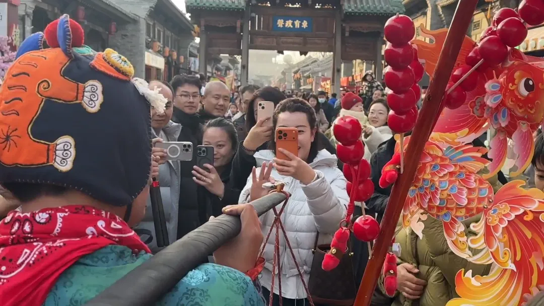 今年春节,太原古县城最火的不是花灯,不是演出,而是一位挑着扁担、自带喜感的卖货郎。