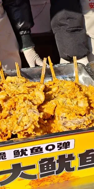 轰炸大鱿鱼在铁板上滋滋作响,一米肉串引得小朋友排队品尝。