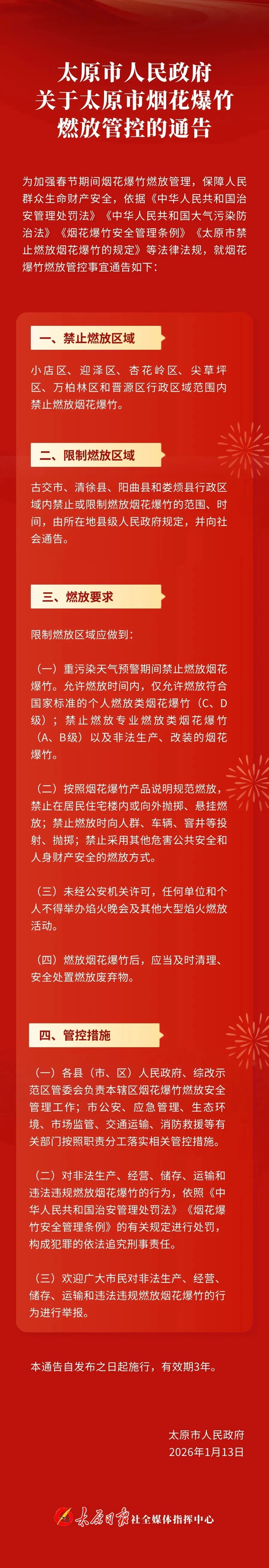 >【便民提醒】太原市人民政府关于太原市烟花爆竹燃放管控的通告