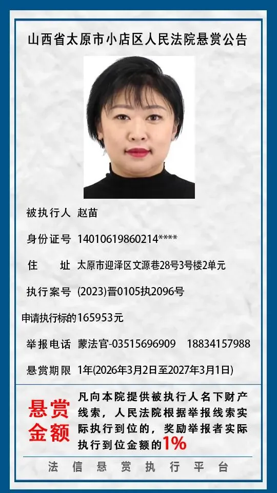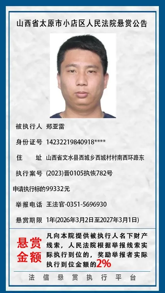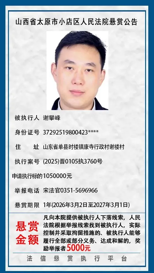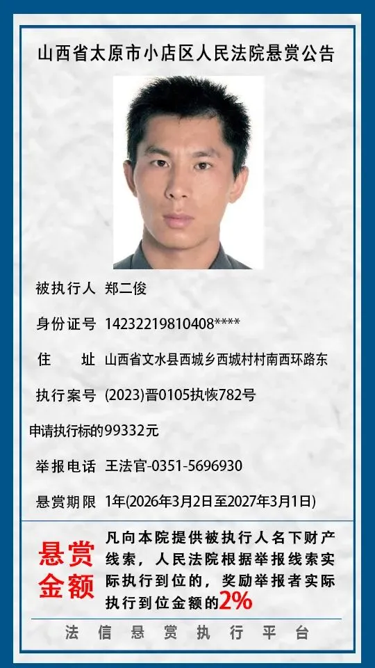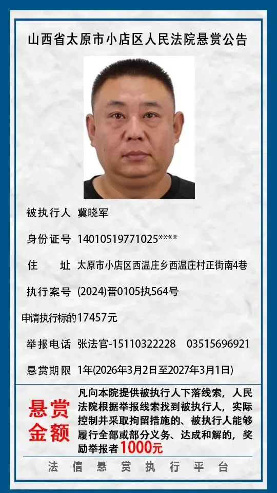 山西省太原市小店区人民法院悬赏公告(2026年3月第二期)