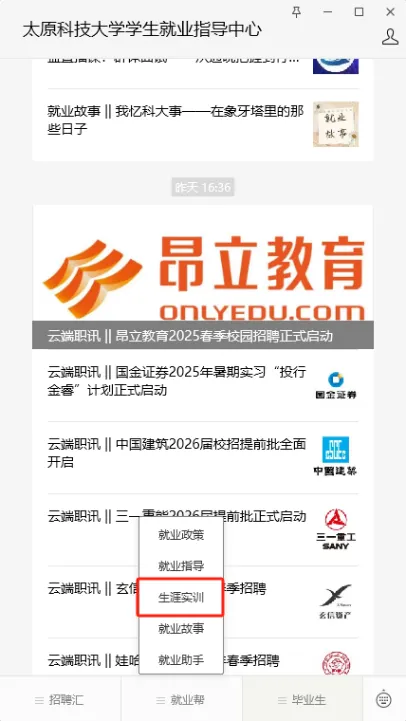 关注 “太原科技大学学生就业指导中心” 公众号 → 点击【就业帮】→【生涯实训】→【我的】,选择 “太原科技大学”,输入学号和身份证后六位进行绑定登录。