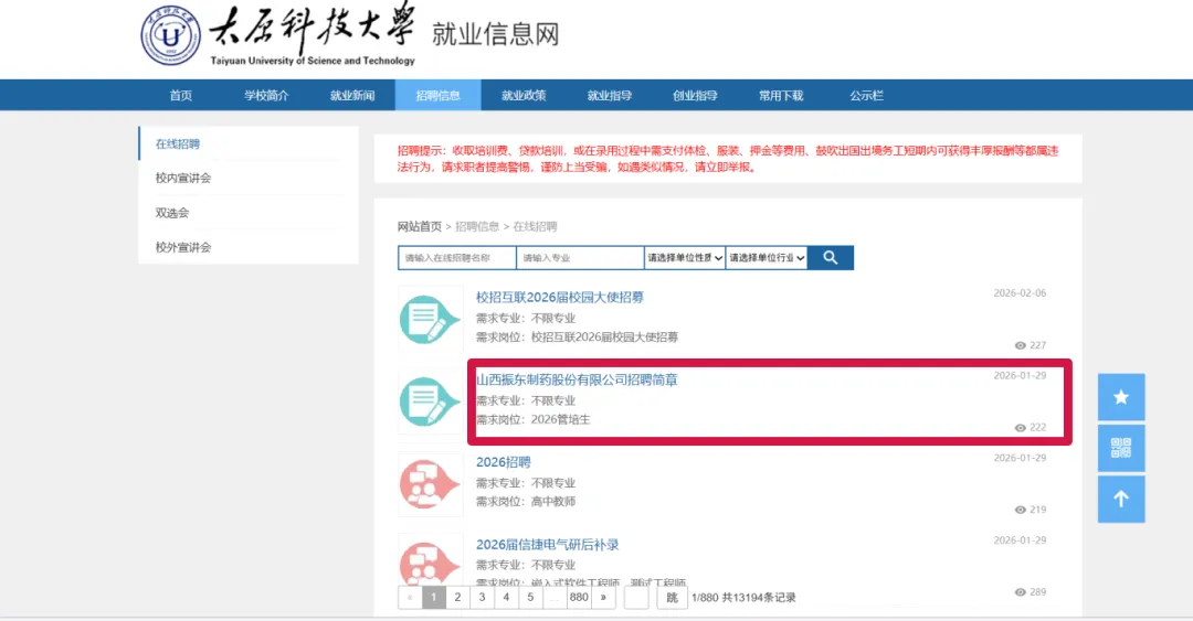 网址:太原科技大学就业信息网:https://job.tyust.edu.cn/