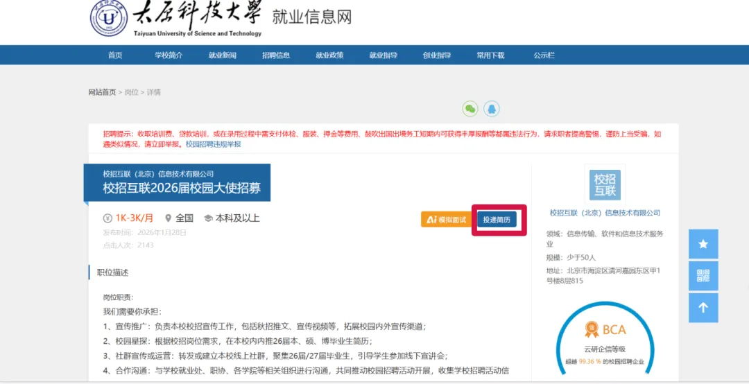 免责声明:太原科技大学学生就业指导中心微信公众号系信息发布平台,旨在为学生提供就业相关信息与服务。平台所发布的部分内容来源于用人单位、合作机构或其他第三方渠道,如涉及侵权,请相关权利人联系我们删除。