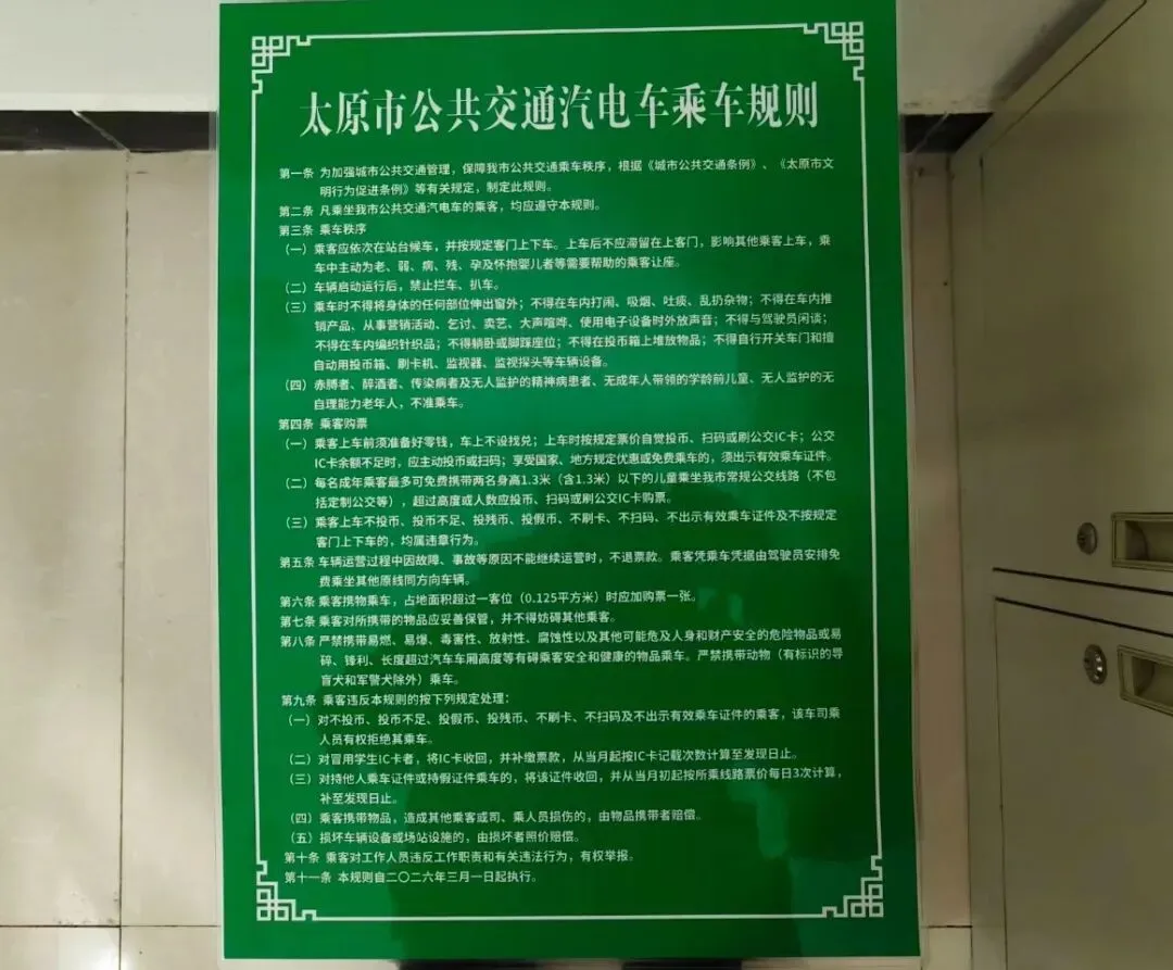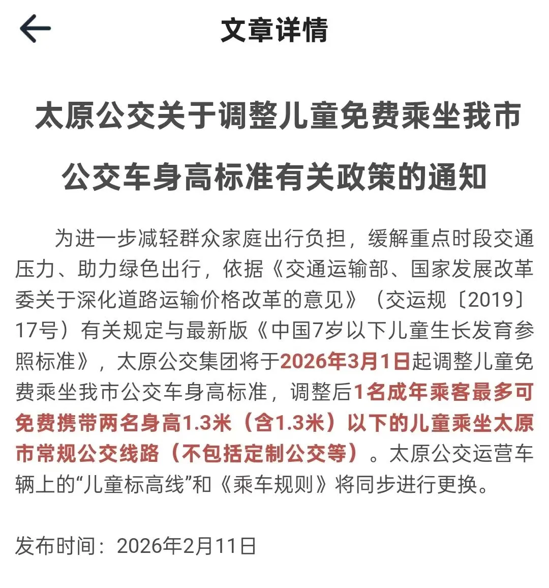 为进一步减轻群众家庭出行负担,缓解重点时段交通压力、助力绿色出行,依据《交通运输部、国家发展改革委关于深化道路运输价格改革的意见》(交运规〔2019〕17号)有关规定与最新版《中国7岁以下儿童生长发育参照标准》,太原公交集团公司于2026年3月1日起调整儿童免费乘坐我市公交车身高标准,调整后1名成年乘客最多可免费携带两名身高1.3米(含1.3米)以下的儿童乘坐太原市常规公交线路(不包括定制公交等)。太原公交运营车辆上的“儿童标高线”和《乘车规则》将同步进行更换。