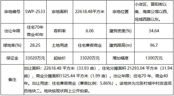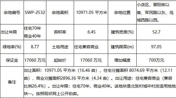 其中一块编号是SWP-2532。位置是晋阳街以南、军民路以东、坞城西路以西。大约是16亩出头的样子,商住两用的地块,起价1.7亿元。容积率比较高,很明显是高层近百米了。