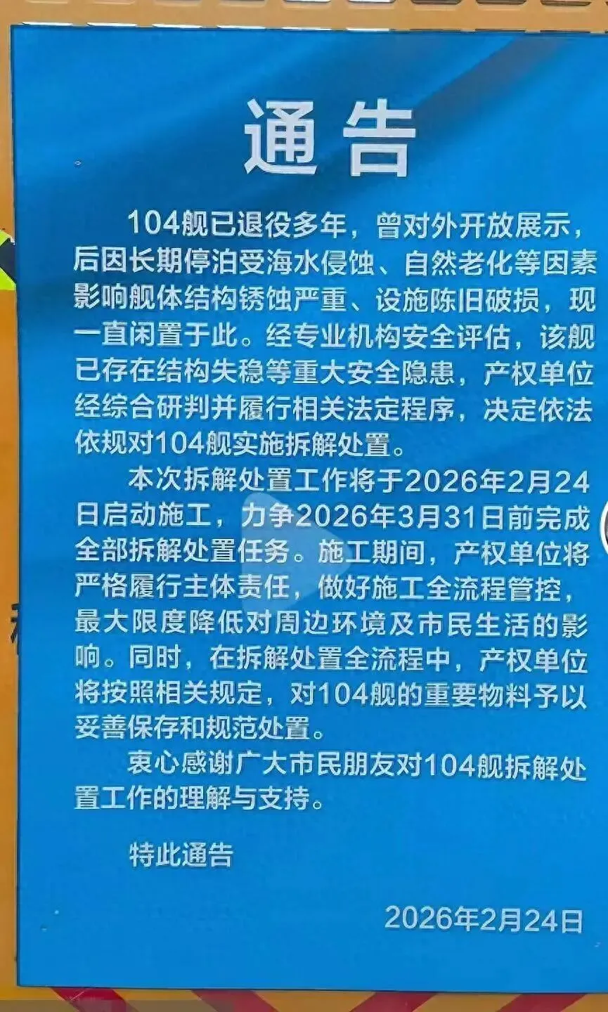 但由于长期停泊遭受海水侵蚀,自然老化,疏于维护,舰体结构设失严重,设施陈旧破损等等一连串的不利件,导致老化严重,经评估后认为。“该舰已存在结构失稳等重大安全隐患,产权单位经综合研判并履行相关法定程序,决定依法依规对104舰实施拆解处置”