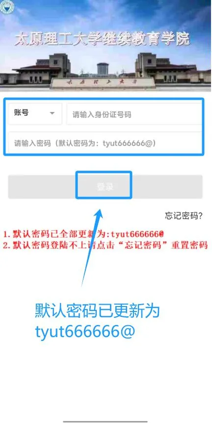tyut666666@),首次登录需绑定手机号,设置新密码;提交后,在登录页面输入