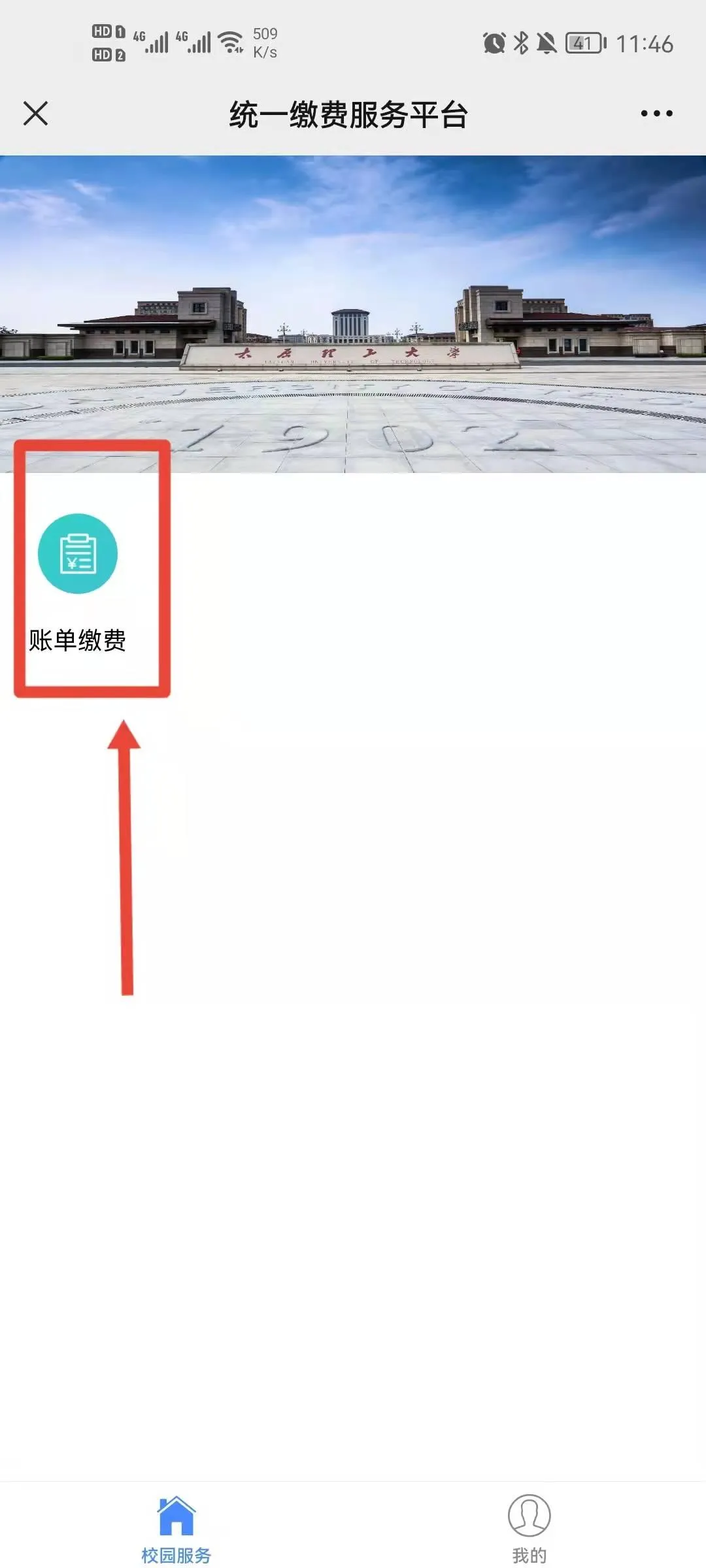 第四步:登录自助缴费系统后,点击“账单缴费”进入账单缴费核对姓名及身份信