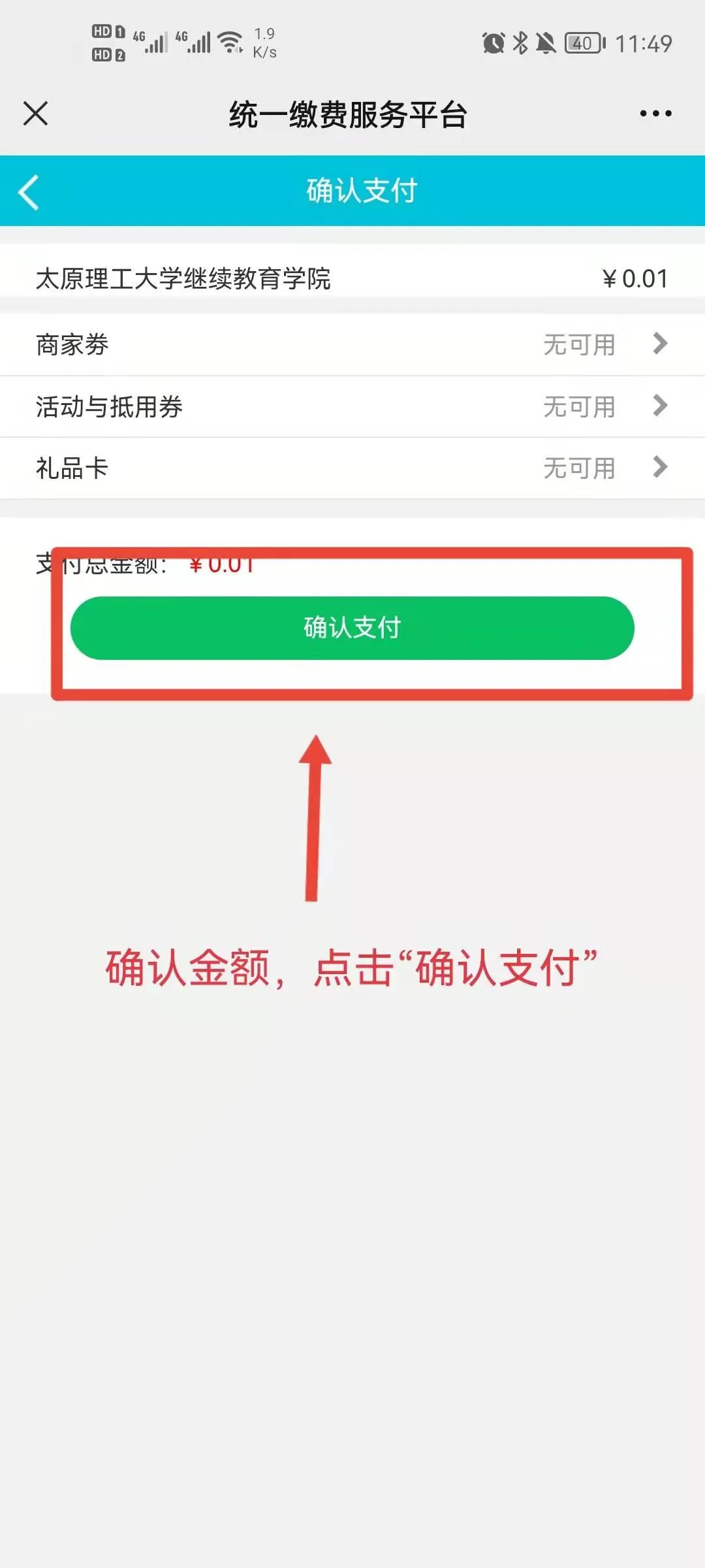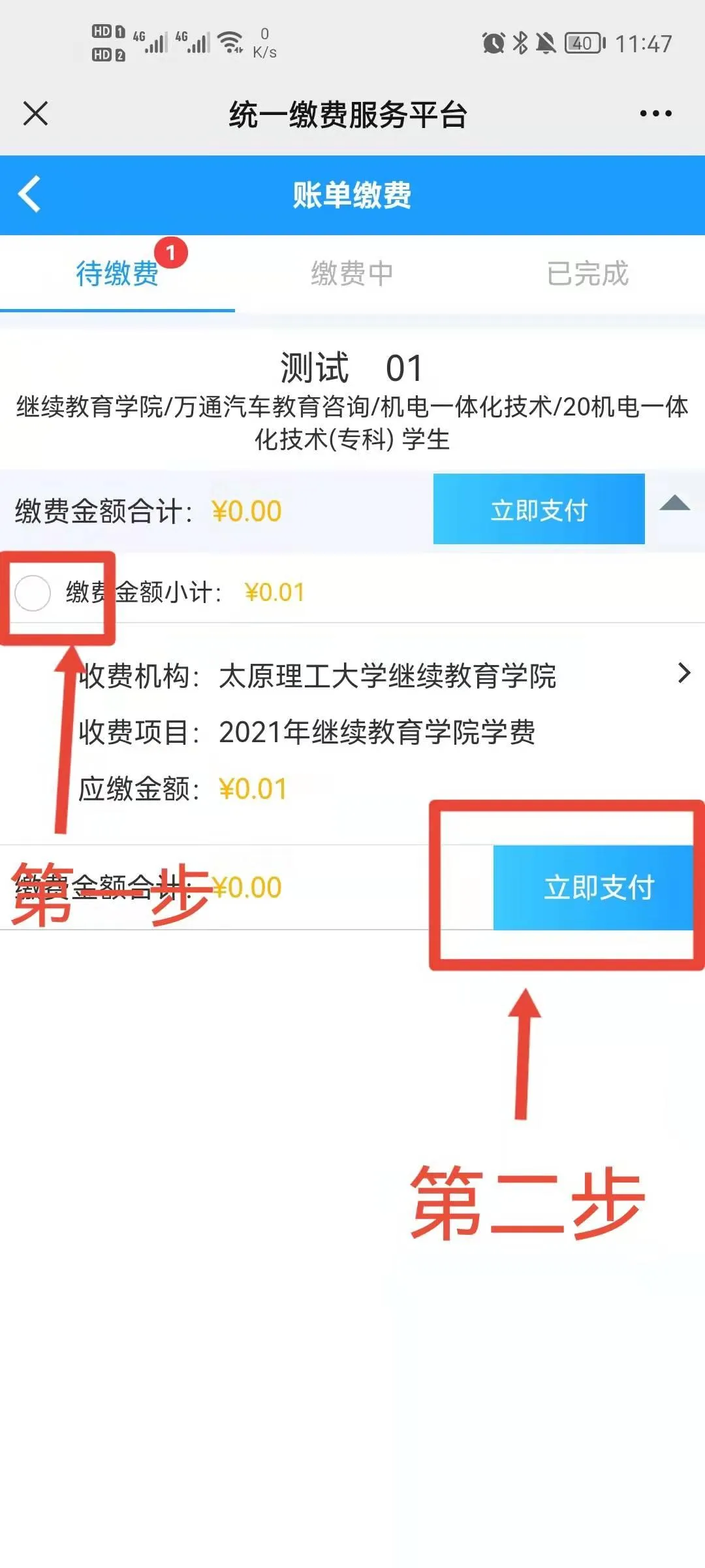 息、项目、金额是否正确,确认后点击“立即支付”,进入支付页面