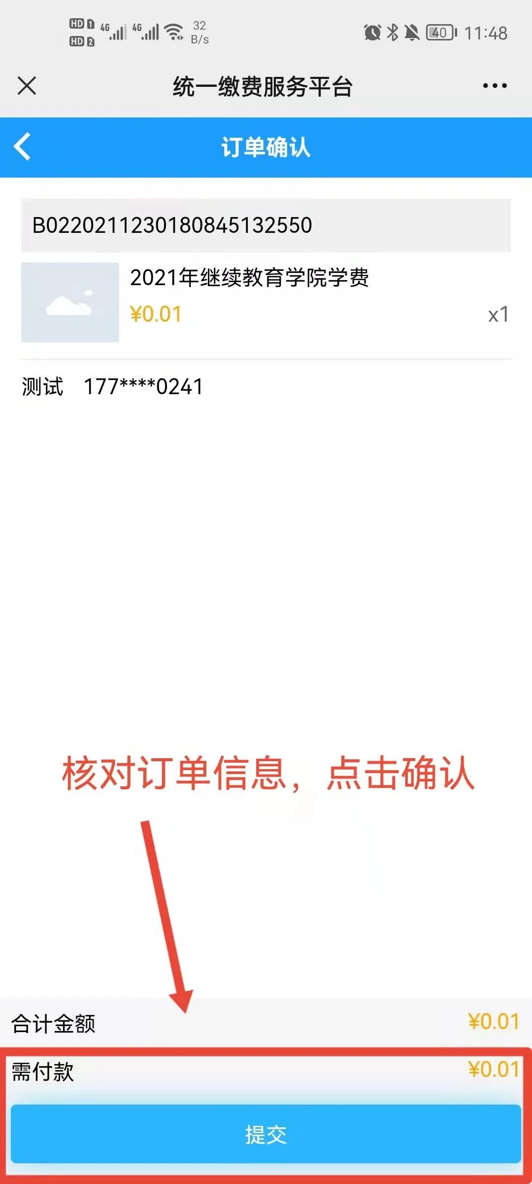 第五步:在订单确认页面,再次确认金额无误后,点击“提交”并根据提示完成支