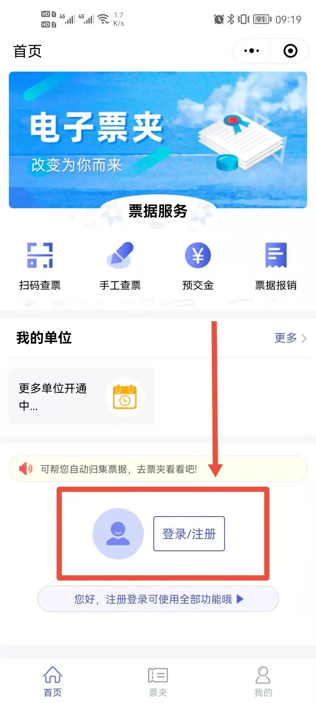 1) 在自助缴费系统缴费后,微信搜索“电子票夹”小程序;点击“登录/注册”