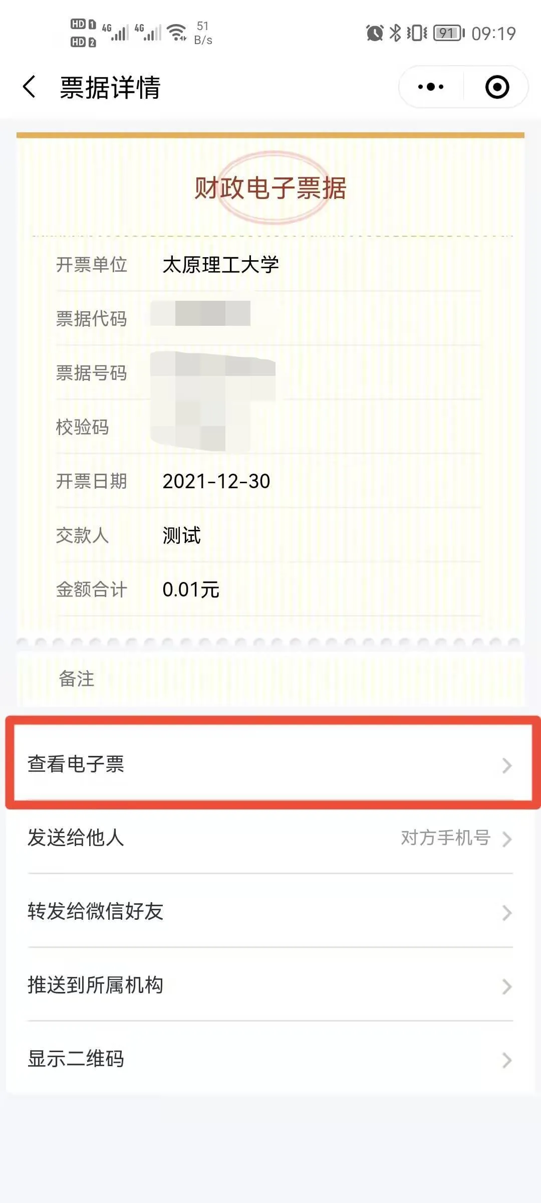 即可看到电子票据图片及详情;长按财政非税电子票据图片保存或发送到邮箱;