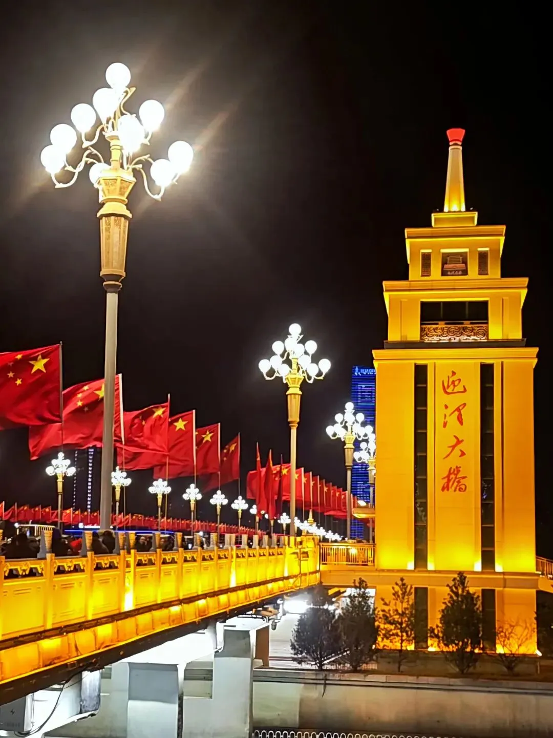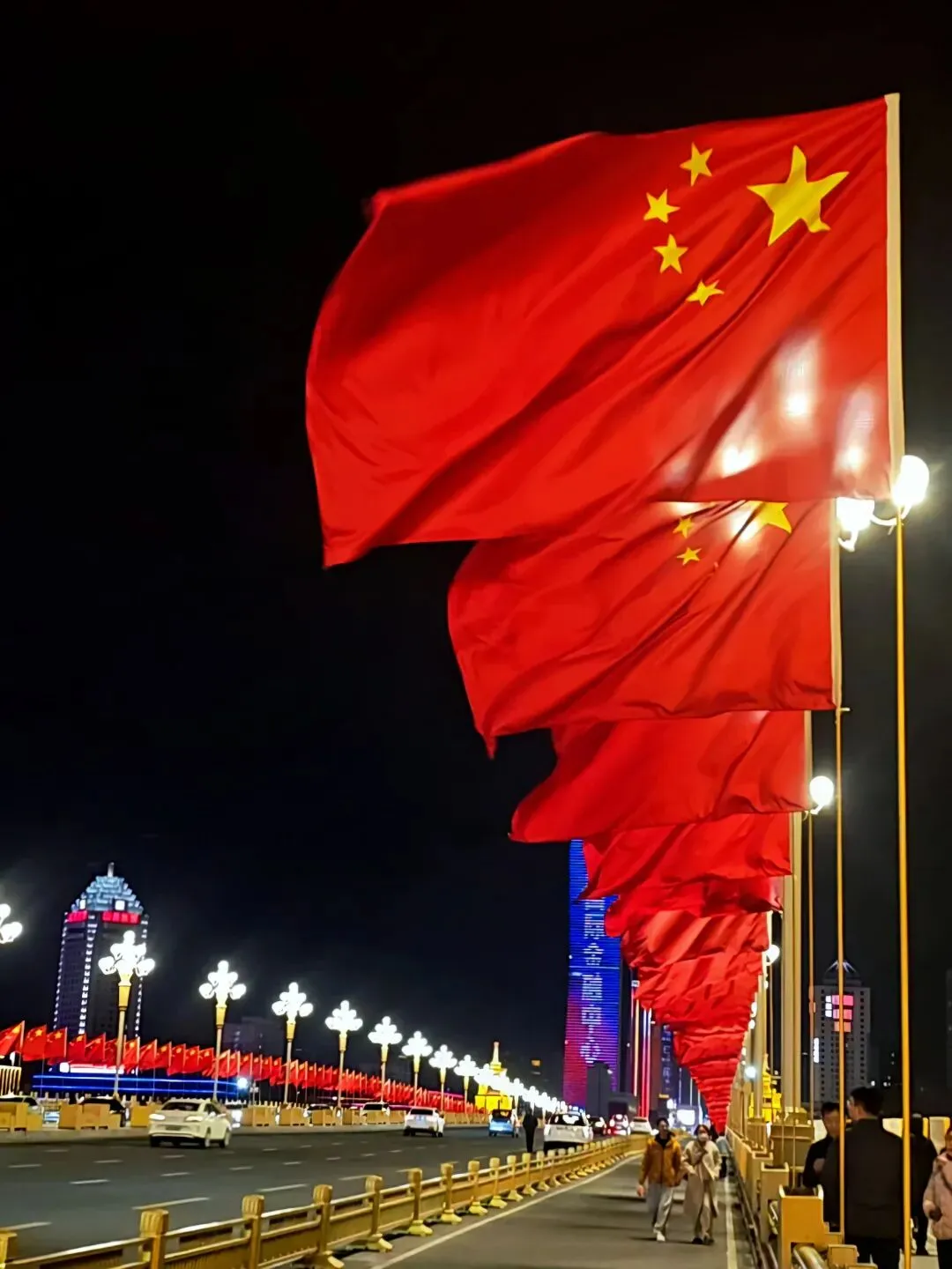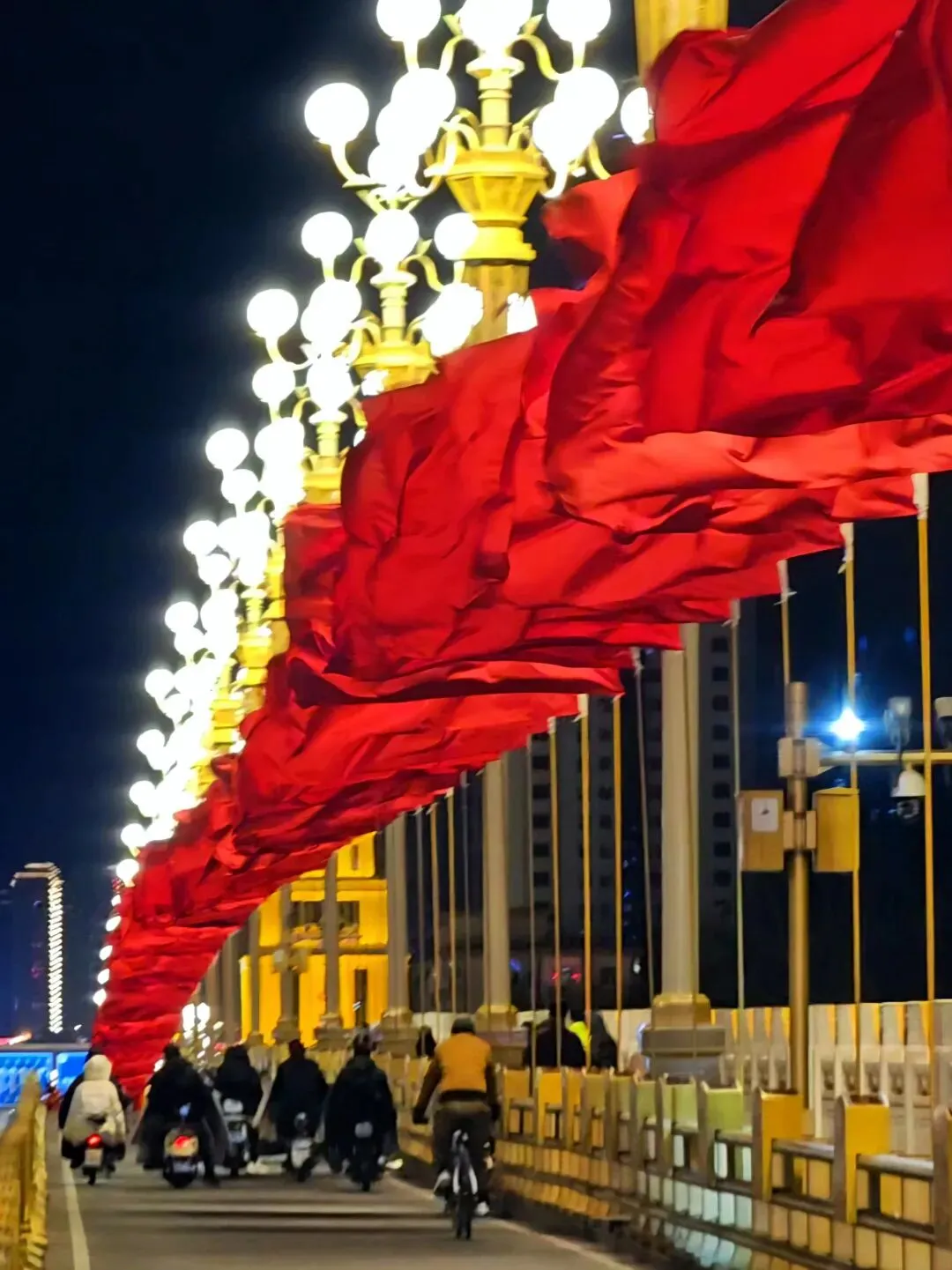 晚风轻拂,数百面红旗在夜色里翻涌,像一片炽热的红海;金色灯柱洒下暖光,与旗影交叠,流淌成河。行人放缓脚步,或抬头凝望,或举机记录;车流从桥面缓缓穿过,汇入墨蓝夜空下的城市脉搏。那一刻,年是团圆,国是万家,而桥,成了连接这一切的情感坐标。