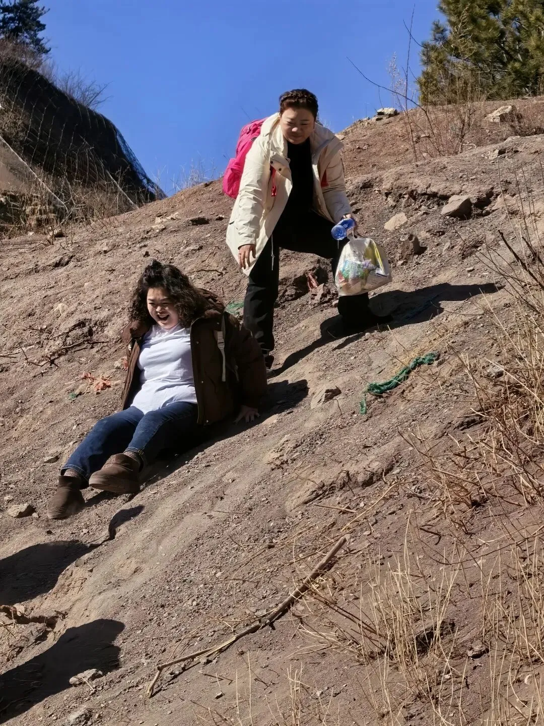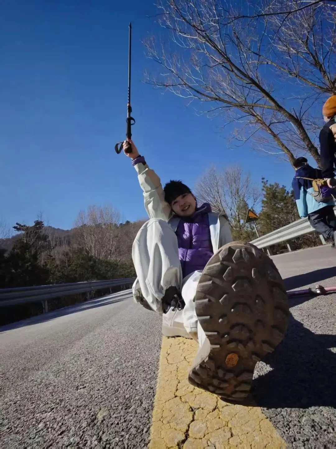 缓坡碎石段(后段):坡度缓和,碎石松散,结冰后易滑,登山杖可辅助;过山洞后有小段公路衔接。