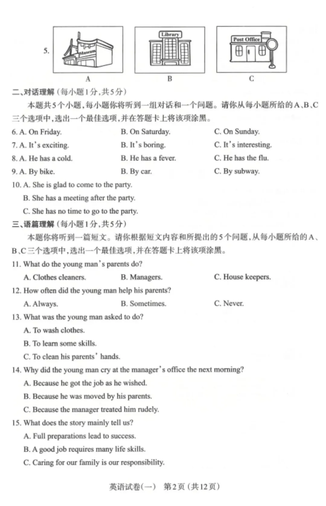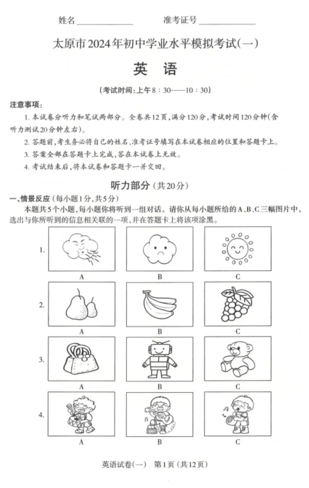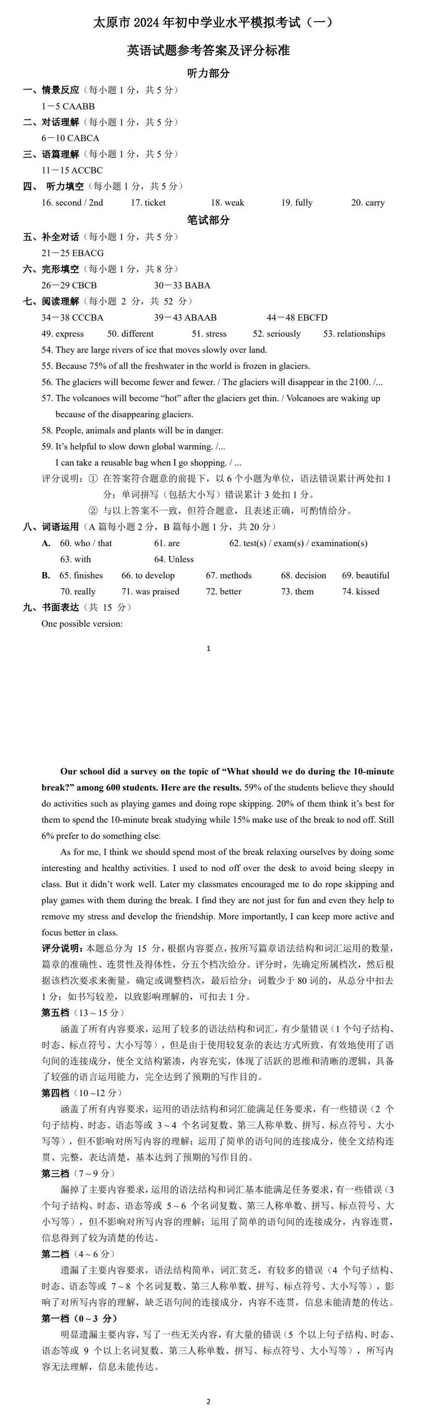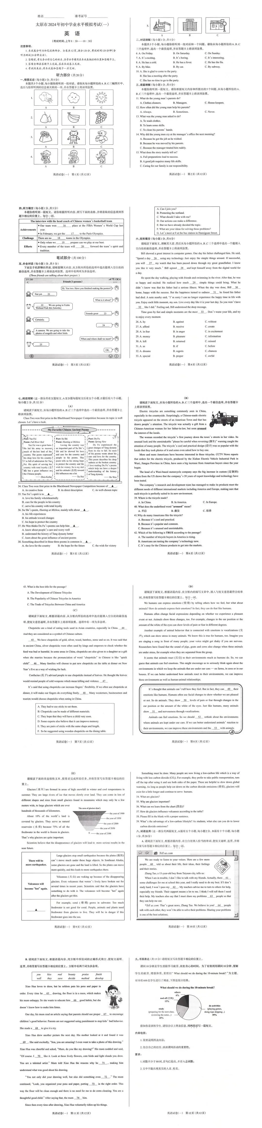 【市一模】太原市2024年初中学业水平模拟考试(一)英语试卷+听力+答案