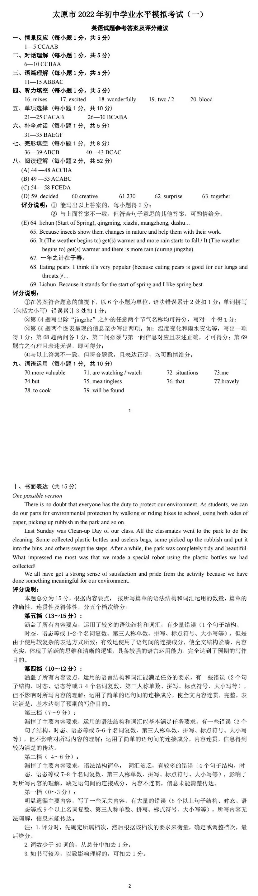【市一模】太原市2022年初中学业水平模拟考试(一)英语试卷+听力+答案
