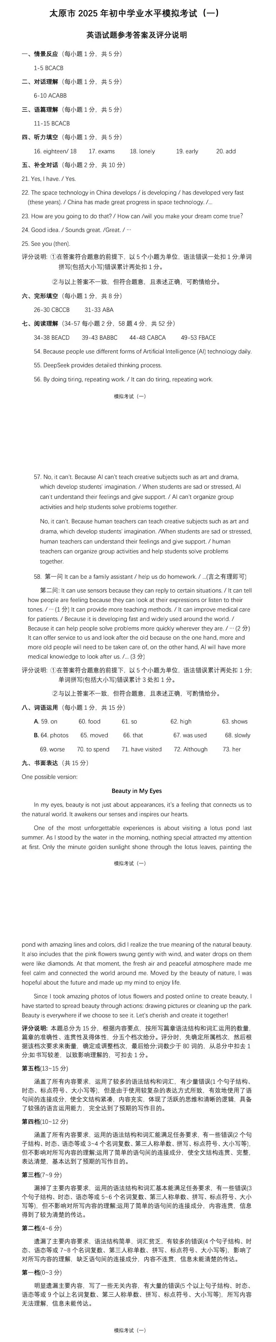 【市一模】太原市2025年初中学业水平模拟考试(一)英语试卷+听力+答案