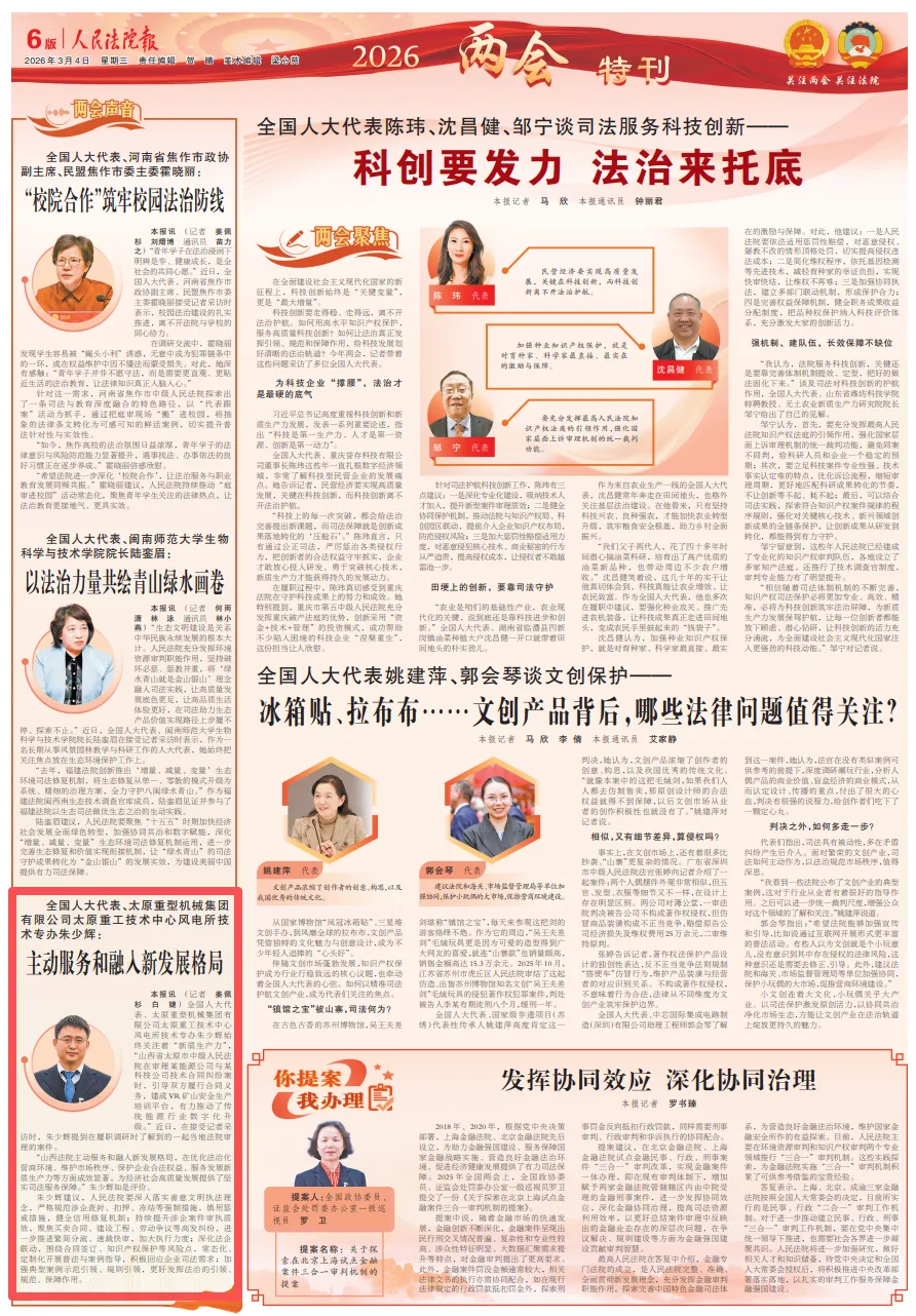 全国人大代表、太原重型机械集团有限公司太原重工技术中心风电所技术专办朱少辉始终关注着“新质生产力”,“山西省太原市中级人民法院在审理某能源公司与某科技公司技术合同纠纷案时,引导双方履行合同义务,建成VR矿山安全生产培训平台,有力推动了传统能源行业数字化升级。”近日,在接受记者采访时,朱少辉提到在履职调研时了解到的一起当地法院审理的案件。