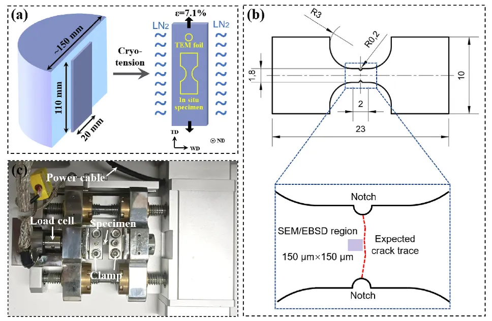 图1. (a)试样制备与深冷预拉伸过程示意图。图中ND、TD和WD分别表示法向、拉伸方向和宽度方向。(b)用于原位拉伸试验的试样尺寸(单位:mm)。(c)装有试样的原位拉伸台照片。