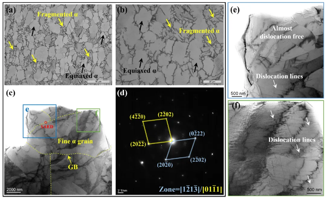 图3. (a,b)不同放大倍数下深冷预拉伸合金的光学显微结构。(c)深冷预拉伸合金的TEM显微结构。(d)图(c)中标示区域的选区电子衍射花样。(e,f)显示图(c)中标示区域位错特征的放大图像。