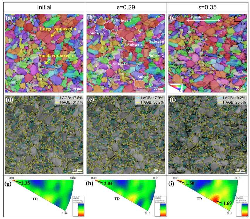 图4. 初始态、29%变形和35%变形试样的取向图(a-c)、晶界图(d-f)和反极图(g-i)。