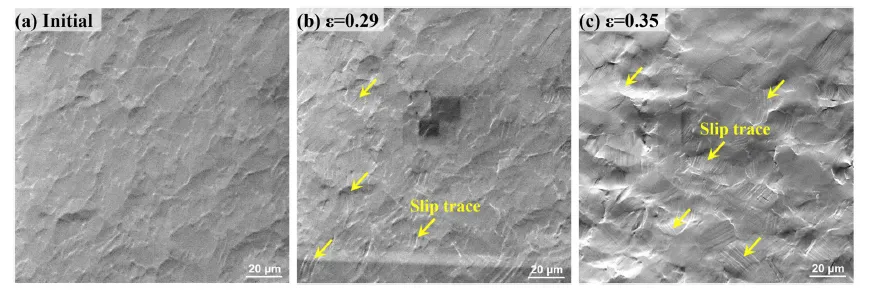 图5. (a-c)显示初始态、29%变形和35%变形试样表面形貌的SEM图像。
