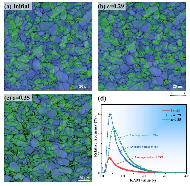图6. (a-c)初始态、29%变形和35%变形试样的KAM图。(d)KAM值分布。
