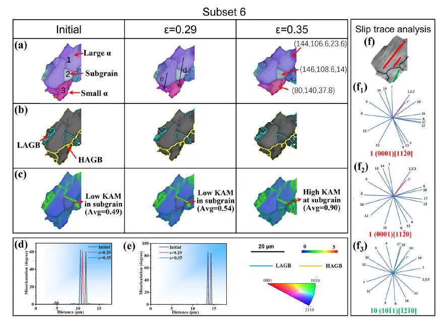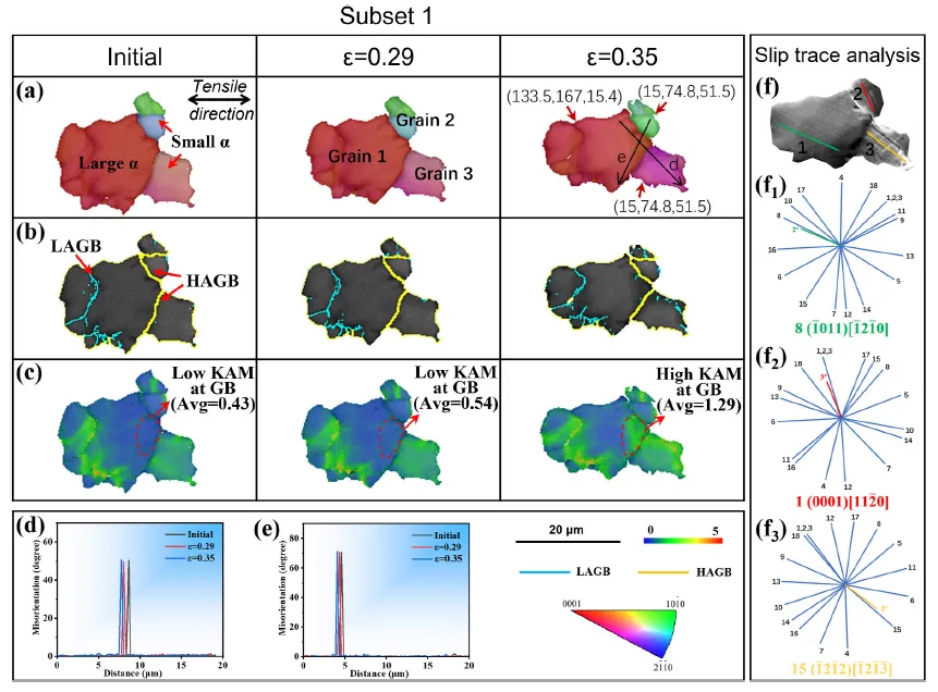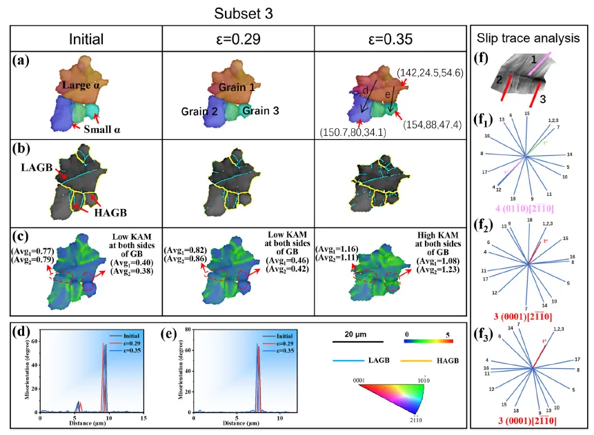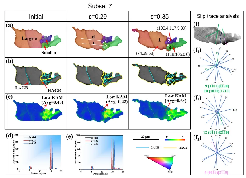 图13. 原位拉伸试验过程中子区域7的取向图(a)、晶界图(b)和KAM图(c)。(d,e)图(a)中标示线的取向差分布曲线。(f)35%变形后子区域7的SEM图像。(f₁-f₃)分别为晶粒1-3的18个滑移系计算理论可能滑移迹线与观察到的滑移迹线。最佳匹配被确定为已激活滑移系并显示在图中。
