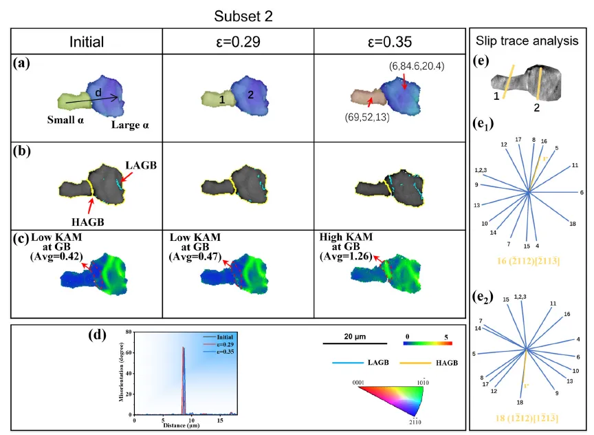 图8. 原位拉伸试验过程中子区域2的取向图(a)、晶界图(b)和KAM图(c)。图中显示了晶粒2内晶界周围的平均KAM值。(d)图(a)中标示线的取向差分布曲线。(e)35%变形后子区域2的SEM图像。(e₁-e₂)分别为晶粒1-2的18个滑移系计算理论可能滑移迹线与观察到的滑移迹线。最佳匹配被确定为已激活滑移系并显示在图中。